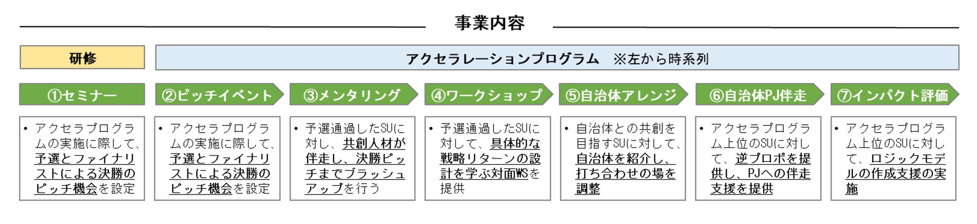 当社の開発したアクセラレーションプログラムでは、研修、ピッチイベント、メンタリング、ワークショップ、自治体アレンジ、自治体プロジェクト伴走、インパクト評価を予定しています。