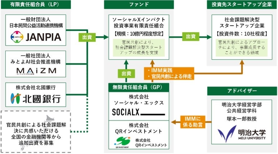株式会社ソーシャル・エックス(東京都渋谷区、以下、当社)は、株式会社北國フィナンシャルホールディングス(石川県金沢市、以下、北國FHD)の投資子会社である株式会社QRインベストメント(石川県金沢市、以下、QRインベストメント)とともに、共同GPとして、官民共創型インパクトファンド「ソーシャルXインパクトファンド」を設立いたしました(https://fund.socialx.inc/)。官民共創の視点から、インパクトスタートアップへの出資・伴走支援を実施していきます。アンカーLPとして、休眠預金等活用制度の指定活用団体である一般財団法人日本民間公益活動連携機構(東京都千代田区、以下、JANPIA)、株式会社北國銀行(石川県金沢市、以下、北國銀行)、一般社団法人みとよAI社会推進機構(香川県三豊市)からの出資を受け、2025年12月末を期限として10億円でファイナルクローズを目指します。